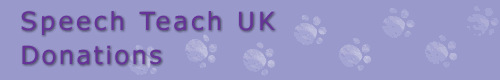 have to rent more server space etc. This where cold, hard cash helps! How to donate using PayPal:To help you donate using a simple and secure system we have signed up with PayPal. PayPal are a hugely successful and multi-national e-business company with 10 million users in 36 countries. You can click on the link to read more. Clicking on the PayPal donate button below will take you to the start of the secure donation procedure. The procedure is quick and easy and we appreciate your time (and money!) Please enter the amount you wish to donate and e-mail address when prompted. You can also send a small message with your donation if you wish and you will receive an e-mail confirmation when completed. You will be returned to our site following donation. Many thanks! Please donate to Speech Teach by selecting the button below: How to Donate by Cheque: |